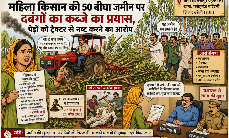 फतेहगंज पश्चिमी।न्यायालय में मुकदमा विचाराधीन होने के बावजूद गांव खिलचीपुर स्थित खेतिहर जमीन पर कब्जे को लेकर एक बार फिर विवाद गरमा गया है। हरियाणा निवासी एक महिला ने स्थानीय दबंगों की मदद से विपक्षी पक्ष द्वारा जबरन कब्जा किए जाने का गंभीर आरोप लगाया है, जिससे क्षेत्र में हड़कंप मच गया।